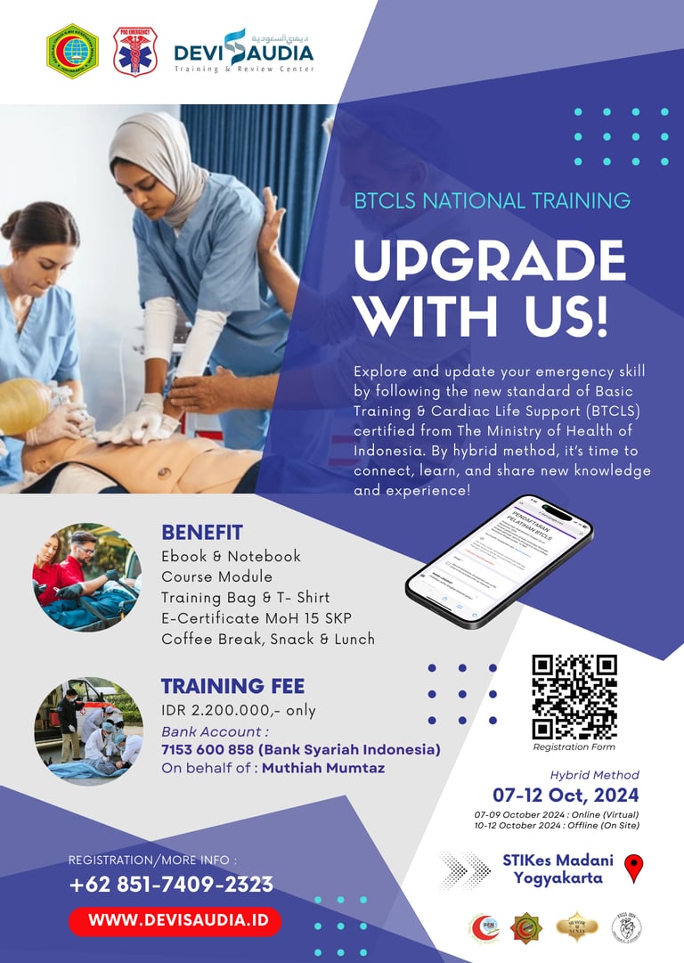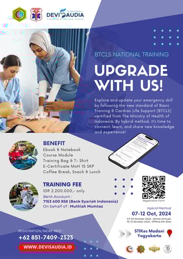 Badan Eksekutif Mahasiswa (BEM) STIKES Madani Yogyakarta dan Pro Emergency didukung oleh Devisaudia.id menyelenggarakan pelatihan Basic Trauma & Cardiac Life Support (BTCLS) yang teregistrasi Kemenkes Republik Indonesia yang didesain untuk para profesional medis, mahasiswa, dan mereka yang berencana memulai karir di klinik atau rumah sakit, baik di dalam maupun luar negeri.